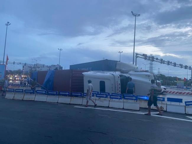 Camera hành trình của 1 ô tô ở Đà Nẵng đã ghi lại được cảnh chiếc xe container lao nhanh tới ngã tư, cố gắng vượt một xe container khác, sau đó rẽ phải và bị lật nhào lên dải phân cách, tông gãy cột đèn đường.