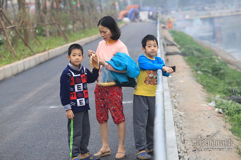 Mẹ con chị Phương (nhà ở đường Láng) hơn một tuần nay chiều nào cũng ra đây,nhưng mùi nước sông ô nhiễm nên chỉchơi được trong chốc lát