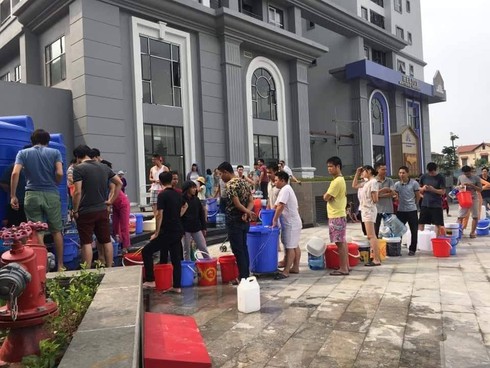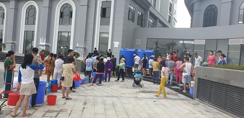 Cư dân tại chung cư Hateco Xuân Phương xếp hàng lấy từng xô nước về để sinh hoạt. |