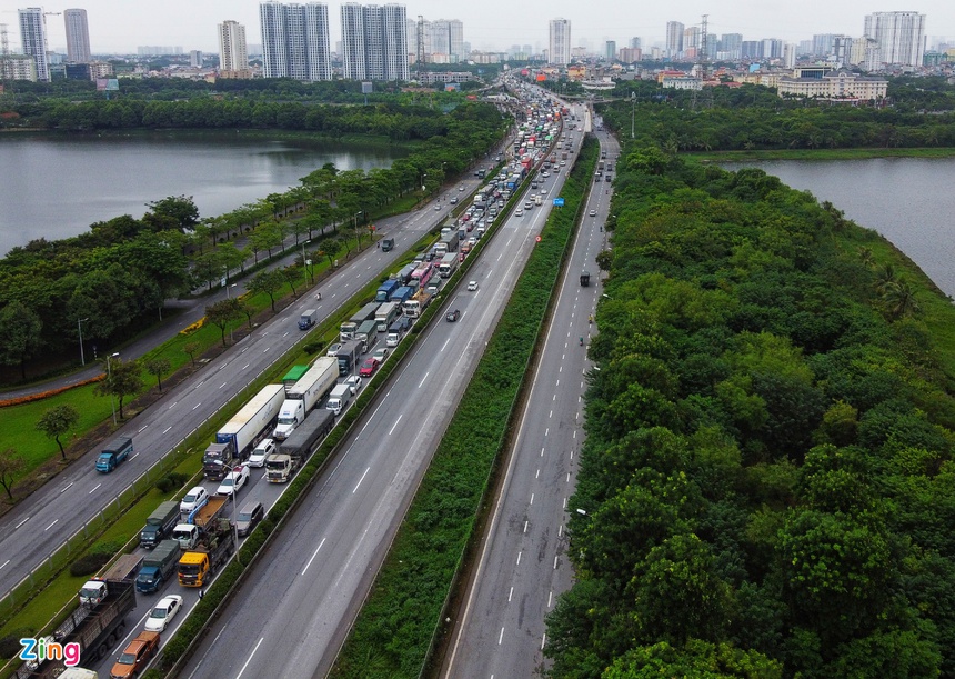 Lúc hơn 16h, ùn tắc kéo dài khoảng 15km, từ cầu Thanh Trì tới khu vực nút giao Trung Hòa (quận Cầu Giấy). |