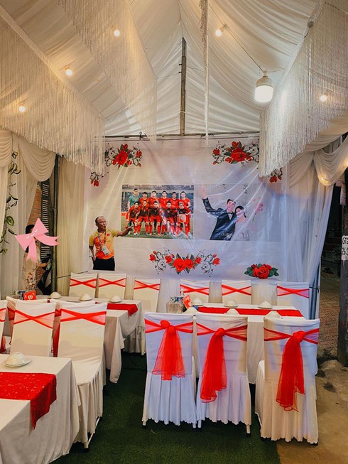 Công tác chuẩn bị đã sẵn sàng. Phông rạp có in hình ĐT Việt Nam, HLV Park Hang Seo và đôi trẻ.Ảnh Facebook:Giang Phạm |