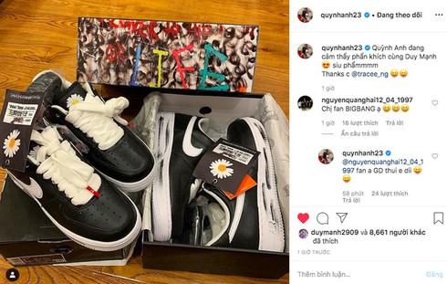 Trên trang cá nhân, 9X cho biết cô là fan của G-Dragon nên rất vui và phấn khích khi mua được đến 2 đôi giày do thần tượng của mình thiết kế.