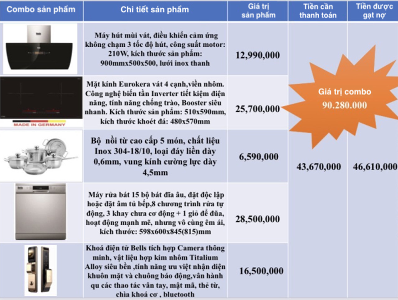 Cụ thể, nhà đầu tư sẽ được cấn trừ nợ bằng các sản phẩm của hãng Bells (Đức) như máy hút mùi, bếp điện, bộ nồi, máy rửa bát, khóa cửa điện tử tích hợp camera... Các sản phẩm được cung cấp theo bốn gói (combo) với giá trị thấp nhất khoảng 36 triệu đồng và cao nhất hơn 90 triệu đồng.