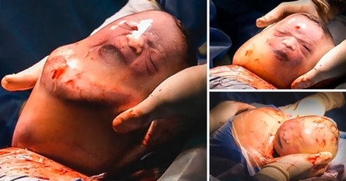 Em bé bĩu môi khi sinh ra trong bọc ối còn nguyên vẹn