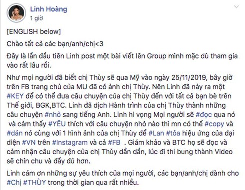 Cụ thể, Hoàng Linh đã chuẩn bị một bài viết bằng tiếng Anh khá dài để kể lại những dấu mốc đáng nhớ trong cuộc đời của Hoàng Thùy. Sau đó, cô đồng loạt chia sẻ lên các diễn đàn nhan sắc với hi vọng câu chuyện của chị gái mình sẽ truyền được cảm hứng cho nhiều người.