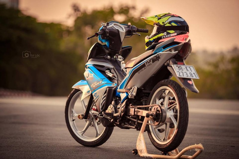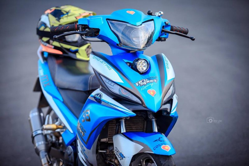 Chiếcxe độsở hữu tông màu xanh pha nhẹ cùng tông màu trắng xám, đi kèm với đó là bộ tem đấu rất sắc cạnh và lịch lãm. Chủ xe cũng không quên trang trí nhẹ cho phần đầu một tí đồ chơi để làm kiểng điển hình nhưbao tay Domino, chóa đèn chính được mod lại sử dụng bi cầu xe hơi cho ánh sáng xa và rộng khi vào các cung đường đêm. |