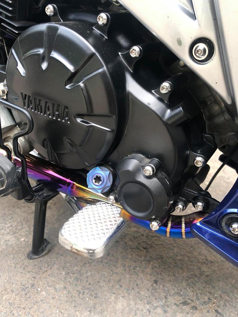Góc nhìn này ta có thể thấy thêmtrợ lực sườn Matrishàng hiệu với ty vàng cực đẹp. Việc trang bị món đồ chơi này sẽ tăng giá trị cho xe cũng như hỗ trợ tay lái 1 phần nào đó khi chạm ngưỡng tốc độ cao. Phía sau lấp ló vớiphuộc Ohlins bình dầu rờigiúp tăng độ êm ái cũng như tăng độ cứng cáp cho xe. |