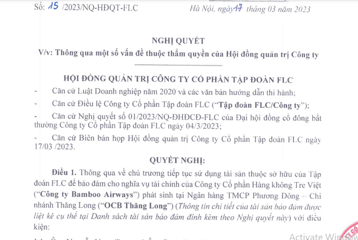 Cũng theo nghị quyết, HĐQT FLC cũng yêu cầu Bamboo Airways có cam kết bằng văn bản về việc thực hiện các thủ tục giải chấp để hoàn trả cho FLC các tài sản mà tập đoàn này sử dụng để đảm bảo cho nghĩa vụ tài chính cho Bamboo Airways trong thời hạn 30 ngày, kể từ khi FLC có văn bản thông báo về nhu cầu sử dụng các tài sản trên.