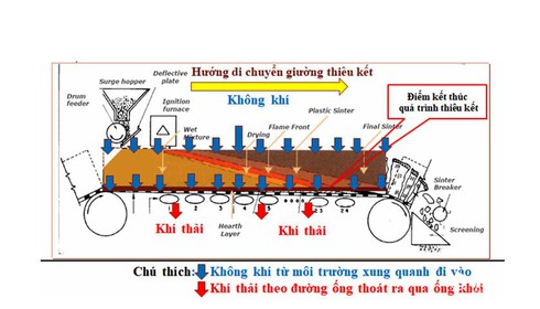Vùng sấy liệu: không khí nóng có tác dụng gia nhiệt cho lớp liệu này trước khi đi vào vùng quặng mềm và thiêu kết, trực tiếp chuyển thành khí thải với nguyên hàm lượng ô xy ban đầu.