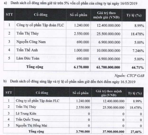 Để chuẩn bị đủ điều kiện niêm yết, CTCP Vật liệu Xây dựng FLC đa dạng hóa danh sách cổ đông với tỷ lệ sở hữu của cổ đông khác tăng vọt lên 55%, đồng thời chính thức đổi tên thành CTCP GAB như hiện nay, vốn điều lệ công ty cũng tăng vọt lên 138 tỷ đồng.