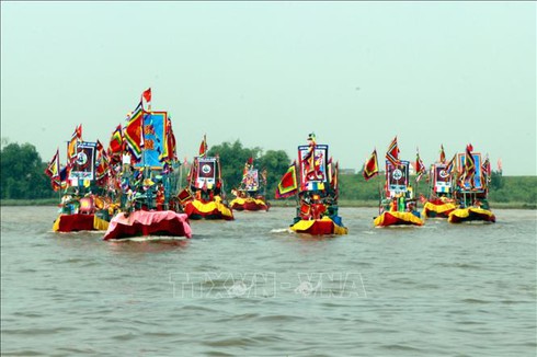Các đoàn thuyền diễn lại cảnh hội quân trên sông Lục Đầu, sáng 15/9. Ảnh: Mạnh Tú/TTXVN |
