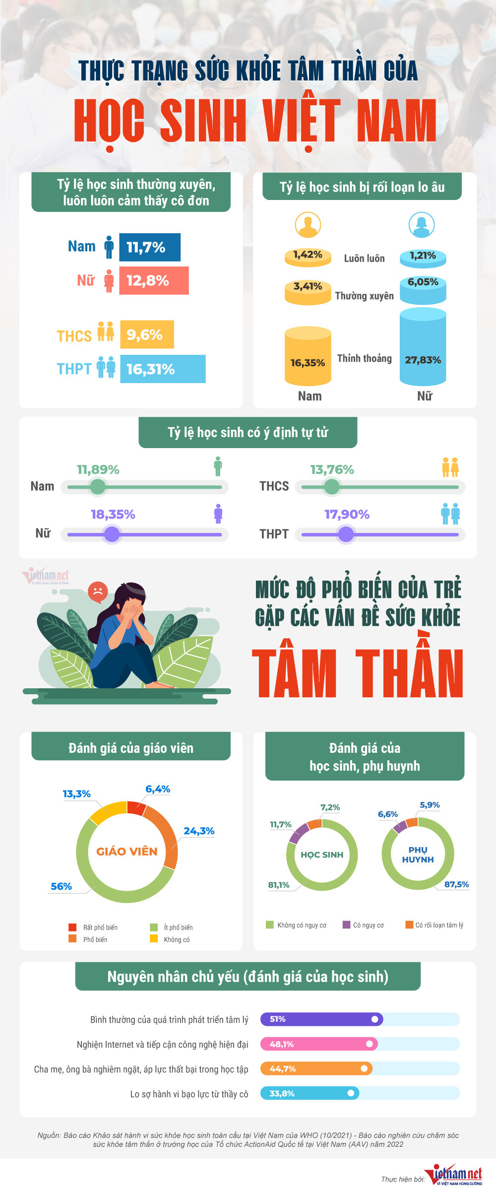Cuối năm 2022, tổ chức ActionAid Quốc tế tại Việt Nam cùng một số đơn vị cũng công bố một báo cáo về chăm sóc sức khỏe tâm thần ở trường học với khảo sát trên 1.000 học sinh, giáo viên và phụ huynh. Gần 50% trẻ tham gia khảo sát này cho rằng cha mẹ khắt khe và áp lực thất bại trong học tập là hai tác nhân chính ảnh hưởng đến sức khỏe tâm thần của các em.