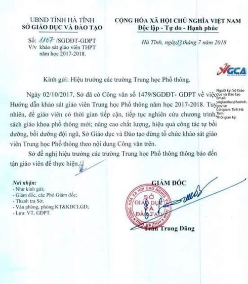 Theo đó, Sở GD&ĐT Hà Tĩnh có công văn 1479/SGD&ĐT –THPT ngày 02/10/2017 về Thi khảo sát giáo viên THPT năm học 2017-2018. Thời gian dự kiến thi vào nửa đầu tháng 8/2018. Nội dung thi sẽ gồm 2 phần.