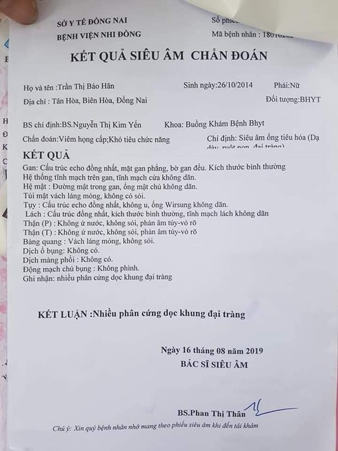 Trước đó, vào sáng 16/8, cháu Hân sốt nhẹ nên gia đình đưa cháu tới Bệnh viện Nhi đồng Đồng Nai khám. Tại đây qua thăm khám, các bác sĩ chuẩn đoán cháu bị viên họng cấp, khó tiêu chức năng và kết luận: “Nhiều phân cứng dọc khung đại tràng”. Sau đó các bác sĩ kê đơn thuốc rồi cho bé ra về để gia đình theo dõi.