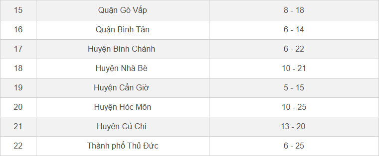 Khu vực có hệ số K tối đa hơn 20 lần gồm huyện Bình Chánh (6 - 22) và huyện Nhà Bè (10- 21). Các quận – huyện còn lại có hệ số K tối đa từ 20 lần trở xuống. Cụ thể như sau: