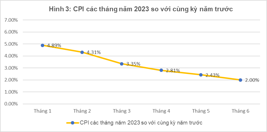 Về chỉ số giá tiêu dùng (CPI), tháng 6/2023 tăng 0,27% so với tháng trước còn so với tháng 12/2022, CPI tháng 6 tăng 0,67% và tăng 2% so với cùng kỳ năm trước.