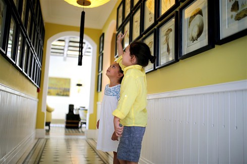 Hai thiên thần nhỏ nhà Hồng Nhung vô cùng thích thú trước thế giới của hàng ngàn loài nấm được mô tả trong những bức vẽ sinh động trên tường, trên trần của khu Chanterelle - Spa by JW sang trọng.