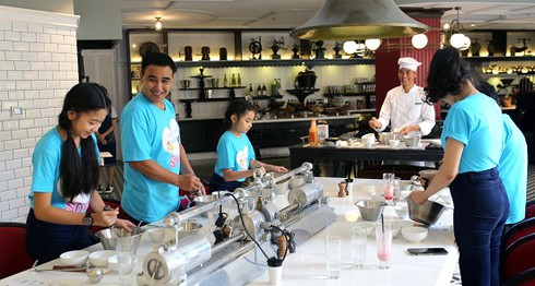 Vợ của MC Bình Minh- chị Anh Thơ hào hứng khi chứng kiến các con trải nghiệm, khám phá các lớp học nấu ăn, vẽ áo thun, làm lồng đèn Hội An...