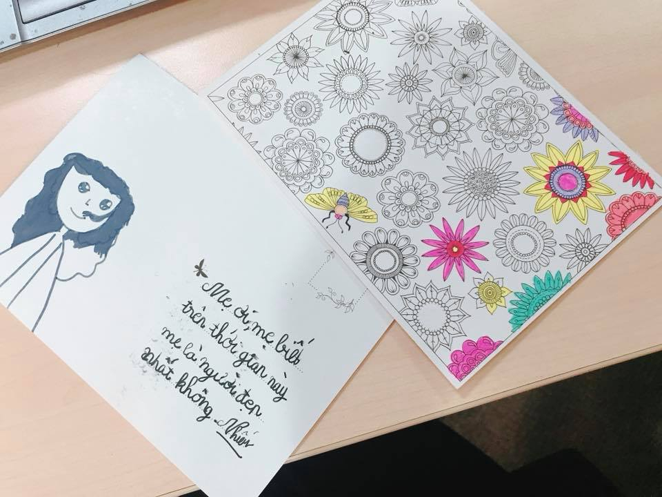 Hồi con 7 tuổi, có mấy hôm không ai đón con nên mẹ phải đưa con lên công ty, dặn con ngồi chơi vẽ ngoan rồi mẹ sẽ cho đi nhà sách. Vậy là con ngồi tô màu và viết bưu thiếp cho mẹ. Những tấm bưu thiếp này mẹ tự hào dán ngay bàn làm việc.