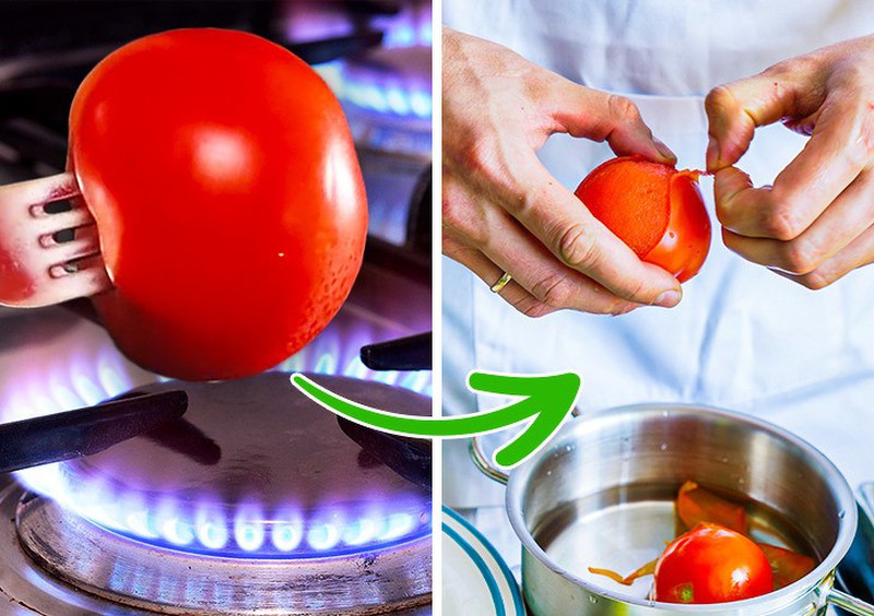 Cách phổ biến nhất để bỏ vỏ cà chua được dễ dàng là thả chúng vào nước nóng trong vòng vài giây. Nhưng có một cách thậm chí còn đơn giản hơn, đó là hơ quả cà chua cách khoảng 10cm trên ngọn lửa, vỏ sẽ được lột bỏ dễ dàng.