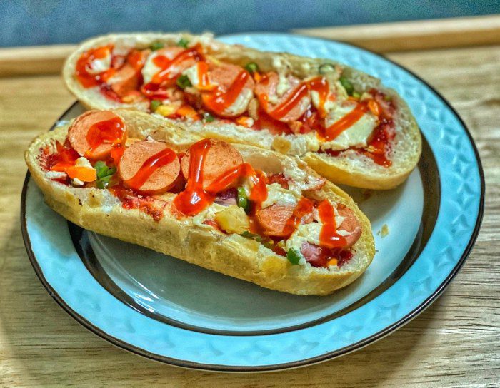 - Ổ bánh mì xẻ làm đôi, sau đó phết tương cà lên, lần lượt cho cà chua, thơm, cà rốt, đậu cove, xúc xích lên miếng bánh mì và cuối cùng là rắc thêm một lớp phô mai lên trên cùng.