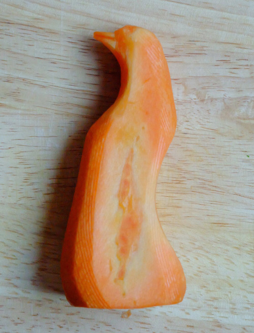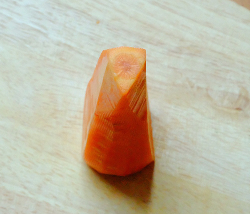 Bào sạch vỏ cà rốt, cắt một đoạn cà rốt từ gốc lên trên khoảng 12-13cm. Cắt vát chéo hai bên cạnh từ đầu nhỏ xuống đầu to. Phía đầu nhỏ, cắt vát một đoạn tạo hình chữ V, kéo dài khoảng 4cm để tạo phần đầu và mỏ của Phượng.