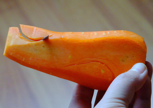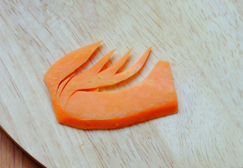 Cắt một lát cà rốt dày khoảng 4mm, dùng dao đầu nhọn khứa tạo hình uốn lượn cho phần lông của đầu Phượng.