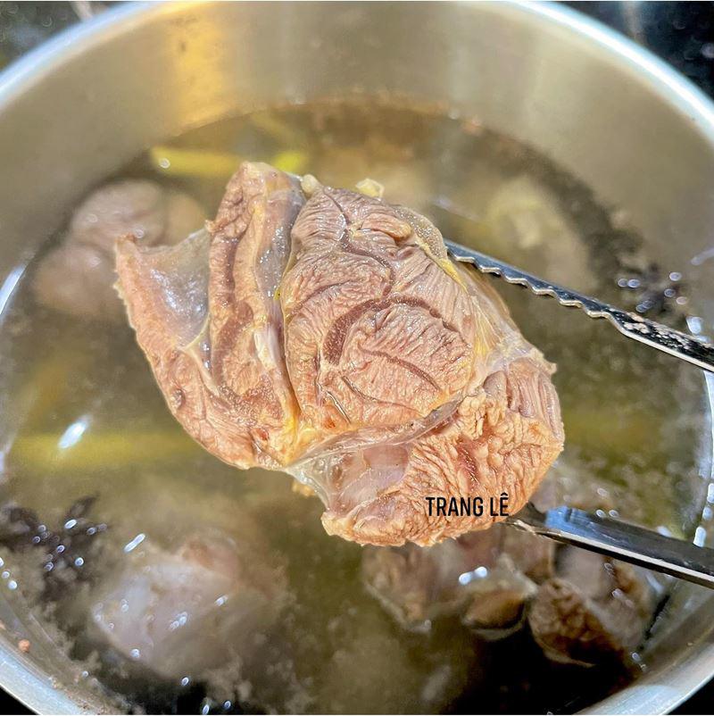 Vớt thịt đã chín ra bát nước đá ngâm đến khi nguội thì để ráo nước. Bóp thật kĩ để ngâm không bị váng.