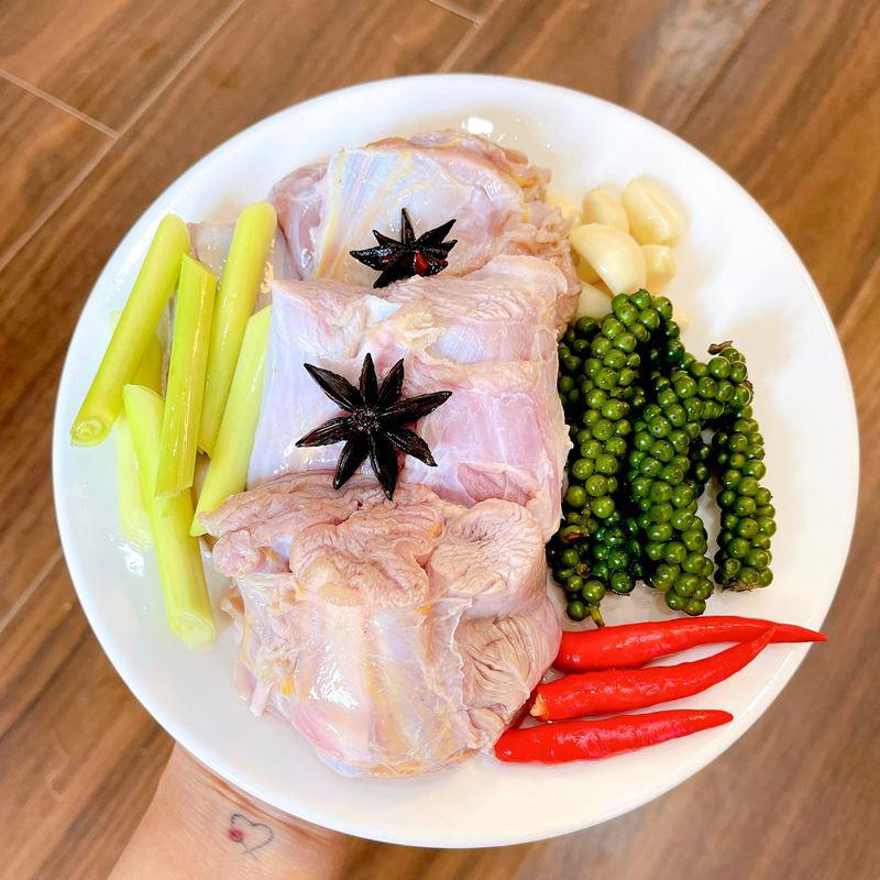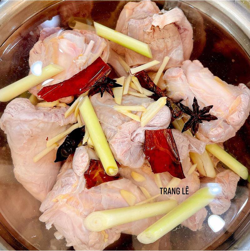 Cho vào nồi nước, đập sả, gừng, 3 nhánh hồi, 1 ít quế thêm chút muối trắng luộc chín tới.