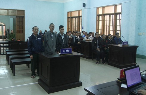 Các bị cáo Nhương, Tiên, Hùng (từ trái qua) tại phiên xét xử sơ thẩm |