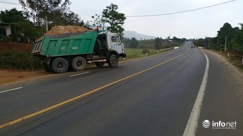 Gần như các xe chở đất đầu có ngọn nghênh ngang lưu thông trên QL 14 nhưng vẫn không bị ai kiểm tra |