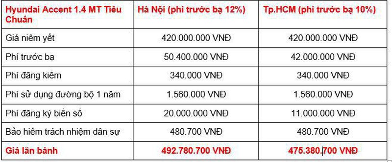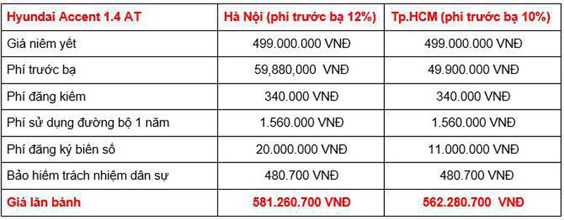 Tại các tỉnh thành khác, tổng chi phí lăn bánh của Accent cũng có sự thay đổi tùy thuộc vào mức phí trước bạ và phí ra biển, dao động trong khoảng từ 470 - 603 triệu đồng, tùy từng phiên bản.