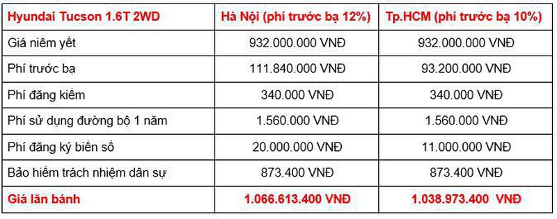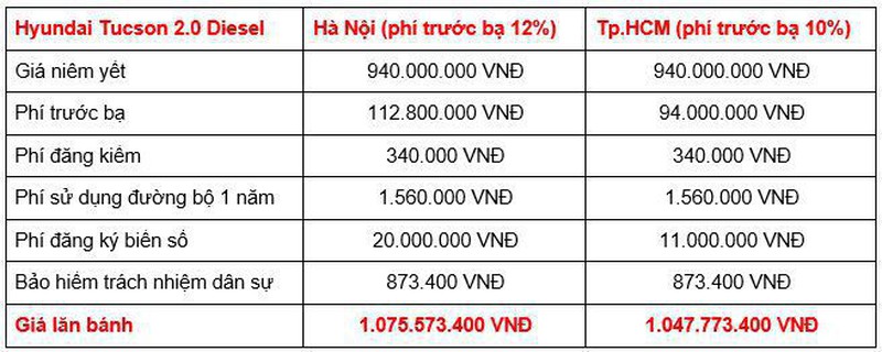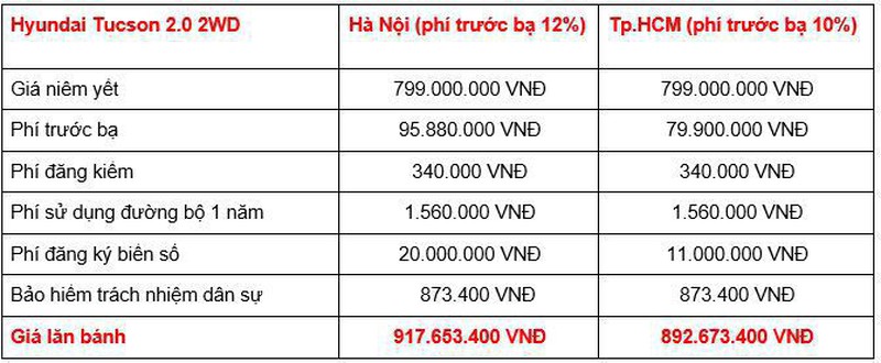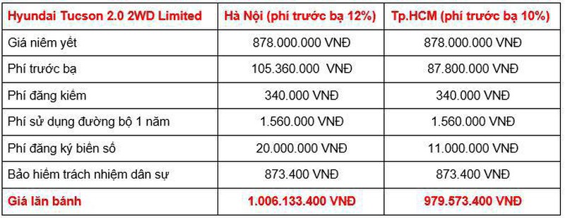 Trên đây là mức giá lăn bánh của 4 phiên bản dành cho các khách hàng tại khu vực Hà Nội và TP.HCM. Do có mức áp dụng tính phí trước bạ và phí ra biển cao hơn TP.HCM và các tỉnh thành khác nên tại Hà Nội, tổng giá lăn bánh của các phiên bản Tucson cũng cao hơn.