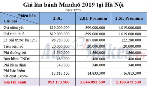 Như vậy sau khi tính tổng các loại thuế, phí thì giá lăn bánh Mazda6 2019 tại Hà Nội lần lượt là: 953 triệu đồng với phiên bản 2.0L; 1,044 tỷ đồng với phiên bản 2.0L Premium và 1,180 tỷ đồng với phiên bản 2.5L Premium.