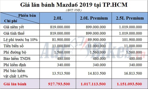 Như vậy sau khi tính tổng các loại thuế, phí thì giá lăn bánh Mazda6 2019 tại TP.HCM lần lượt là: 928 triệu đồng với phiên bản 2.0L; 1,017 tỷ đồng với phiên bản 2.0L Premium và 1,151 tỷ đồng với phiên bản 2.5L Premium.