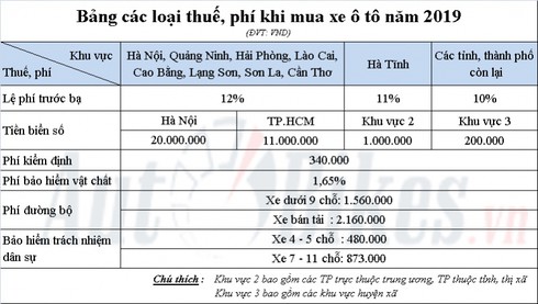 | Bảng các loại thuế phí khi mua xe ô tô năm 2019. |