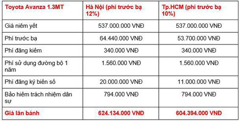 Như vậy, phiên bản AT với giá niêm yết chính hãng 537 triệu đồng thì sau khi cộng dồn các khoản thuế, phí bắt buộc, tổng chi phí lăn bánh tại Hà Nội là ở mức khoảng 624 triệu đồng, khoảng 604 triệu đồng tại TP.HCM, mức tăng lần lượt tương ứng khoảng 87 triệu đồng và 67 triệu đồng. Trong khi đó, phiên bản AT có tổng chi phí lăn bánh khoảng 680 triệu đồng tại Hà Nội và 666 triệu đồng tại TP.HCM.