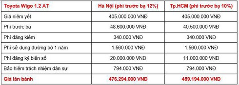 Tại Hà Nội, với mức phí trước bạ 12% và chi phí ra biển 20 triệu đồng (cao hơn so với tất cả các tỉnh thành còn lại) nên tổng chi phí lăn bánh của Wigo trên các phiên bản đều cao hơn, tiếp đến là TP.HCM với mức phí trước bạ 11% và phí ra biển 11 triệu đồng. Cụ thể chi phí lăn bánh của Toyota Wigo như sau:
