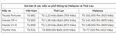 Tại Việt Nam, đa số các mẫu ô tô đều có giá cao hơn các thị trường trong khu vực Châu Á và thường chỉ thua duy nhất Singapore bởi đảo quốc này cần hạn chế phương tiện cá nhân do diện tích quá nhỏ bé.