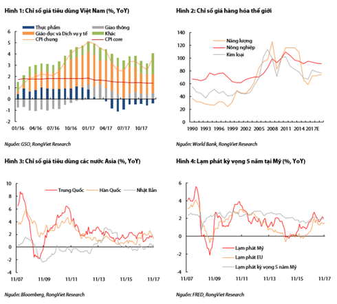 Diễn biến lạm phát trong năm 2017 bị chi phối mạnh bởi các mặt hàng do Nhà nước quản lý. Các đợt tăng giá viện phí và học phí trong năm qua đã đóng góp tới 2,3% vào tổng mức tăng chung. Bên cạnh đó, theo ước tính của CTCK Rồng Việt (VDSC), đợt tăng giá điện bình quân 6,08% đầu tháng 12/2017 đẩy CPI năm 2017 tăng 0,08%.