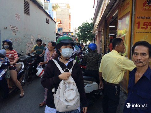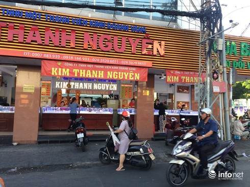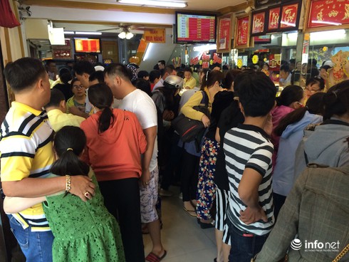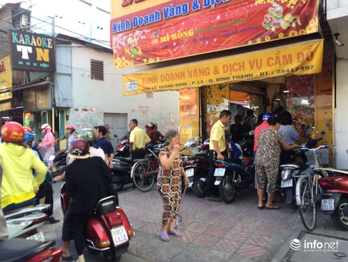 Tại tiệm vàng M.H trên đường Lê Quang Định, quận Bình Thạnh, khách phải đứng xếp hàng chờ đến lượt giao dịch, nhân viên bán hàng làm việc hết công suất. Trước tình trạng quá tải, cửa hàng phải bố trí thêm nhân viên vòng ngoài để phục vụ kiểm đếm tiền cho khách trước khi giao dịch.