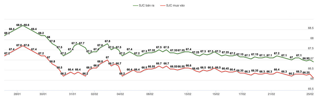 Bước sang đầu tháng 2, giá vàng trong nước điều chỉnh trong các phiên tăng giảm với biên độ chênh lệch chưa tới 500 nghìn/lượng. Chốt phiên giao dịch 25/2, giá vàng miếng 9999 tại SJC TP.HCM là 66,1 triệu đồng/lượng (mua vào) - 66,9 triệu đồng/lượng (bán ra). SJC Hà Nội niêm yết ở mức 66,1 triệu đồng/lượng (mua vào) và 66,92 triệu đồng/lượng (bán ra).