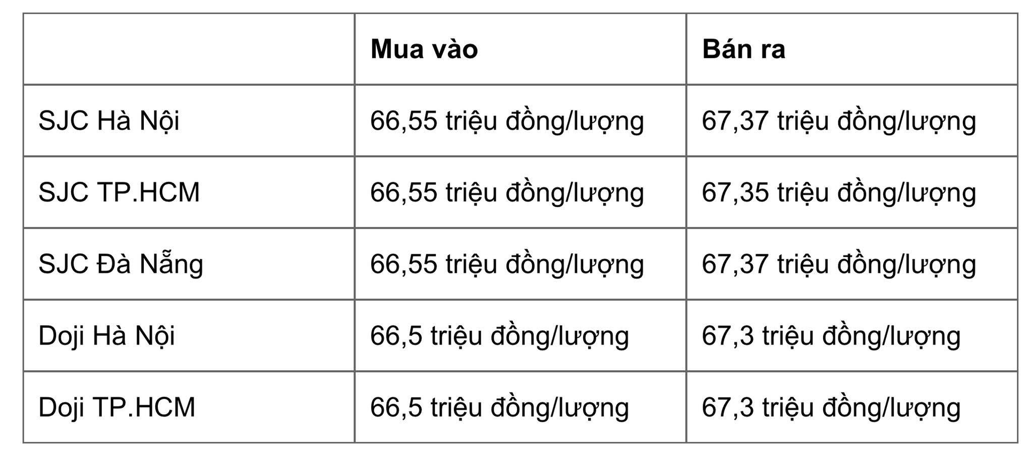 Doji Hà Nội niêm yết ở mức 66,45 triệu đồng/lượng (mua vào) và 67,25 triệu đồng/lượng (bán ra). Doji TP.HCM mua vàng SJC ở mức 66,5 triệu đồng/lượng, bán ra ở mức 67,3 triệu đồng/lượng.