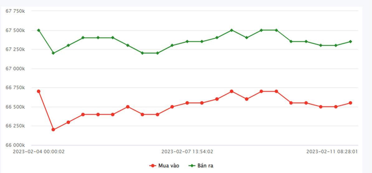 Chốt phiên giao dịch 10/2, giá vàng miếng 9999 tại SJC TP.HCM là 66,5 triệu đồng/lượng (mua vào) - 67,3 triệu đồng/lượng (bán ra). SJC Hà Nội niêm yết ở mức 66,5 triệu đồng/lượng (mua vào) và 67,32 triệu đồng/lượng (bán ra).