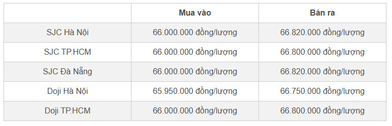 Doji Hà Nội niêm yết ở mức 65,9 triệu đồng/lượng (mua vào) và 66,6 triệu đồng/lượng (bán ra). Doji TP.HCM mua vàng SJC ở mức 66 triệu đồng/lượng, bán ra ở mức 66,6 triệu đồng/lượng.