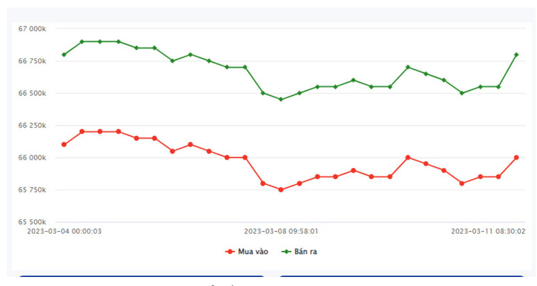 Chốt phiên giao dịch 10/3, giá vàng miếng 9999 tại SJC TP.HCM là 65,85 triệu đồng/lượng (mua vào) - 66,50 triệu đồng/lượng (bán ra). SJC Hà Nội niêm yết ở mức 65,85 triệu đồng/lượng (mua vào) và 66,52 triệu đồng/lượng (bán ra).