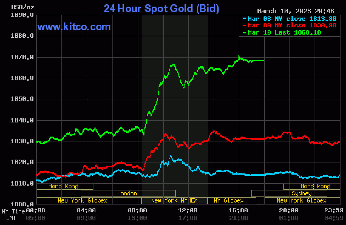 Tới 8h41' hôm nay (ngày 11/3, giờ Việt Nam), giá vàng thế giới giao ngay đứng quanh ngưỡng 1.868,1 USD/ounce, tăng 33,1 USD/ounce so với đêm qua. Giá vàng giao tương lai tháng 4 trên sàn Comex New York ở mức 1.867,2 USD/ounce, tăng 31,2 USD/ounce so với đêm qua.