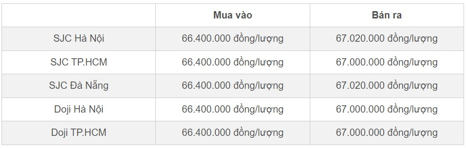 Doji Hà Nội niêm yết ở mức 66,4 triệu đồng/lượng (mua vào) và 67 triệu đồng/lượng (bán ra). Doji TP.HCM mua vàng SJC ở mức 66,4 triệu đồng/lượng, bán ra ở mức 67 triệu đồng/lượng.