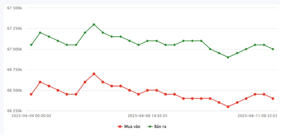 Chốt phiên giao dịch 10/4, giá vàng miếng 9999 tại SJC TP.HCM là 66,45 triệu đồng/lượng (mua vào) và 67,05 triệu đồng/lượng (bán ra). SJC Hà Nội niêm yết ở mức 66,45 triệu đồng/lượng (mua vào) và 67,07 triệu đồng/lượng (bán ra).