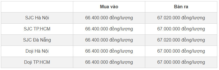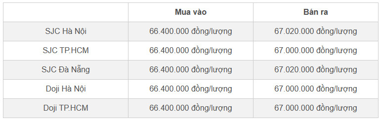 Doji Hà Nội: 66.400.000 đồng/lượng - 67.000.000 đồng/lượng